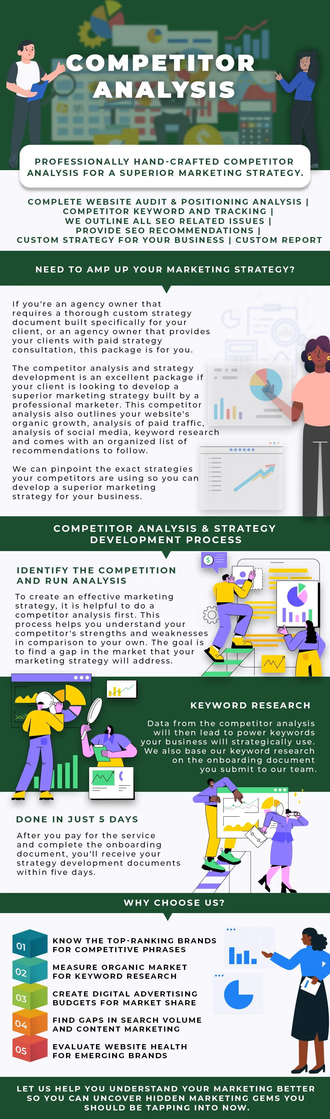 Do you need to understand your marketing a little better? Perhaps, what your competitors are doing and what you can do to improve your bottom line? Get a professionally hand-crafted Competitor Analysis that will uncover hidden marketing gems you can start tapping into NOW to make more money.