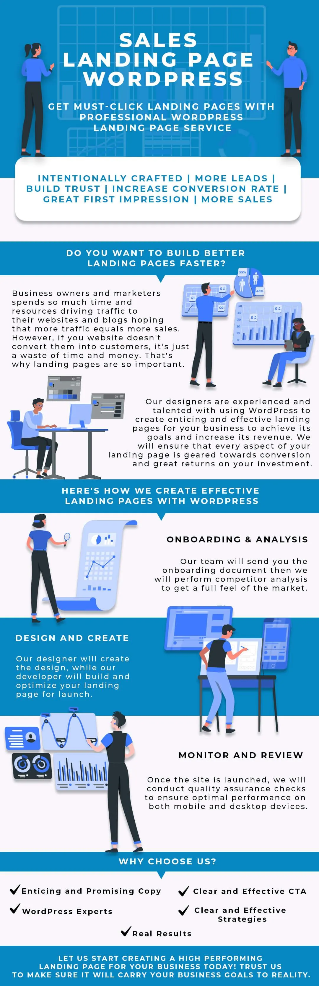 After you pay for this service and complete the onboarding document, we will start designing the initial landing page blueprint. We send you a link to our prototype staging site to see what the landing page design looks like. If you require any changes during our approval process, we can take care of them immediately and send you the revised copies. Your PM (Project Manager) will work with you to get approval. Once the design is approved, we commence the development process, typically taking 5-7 days after the design is approved.