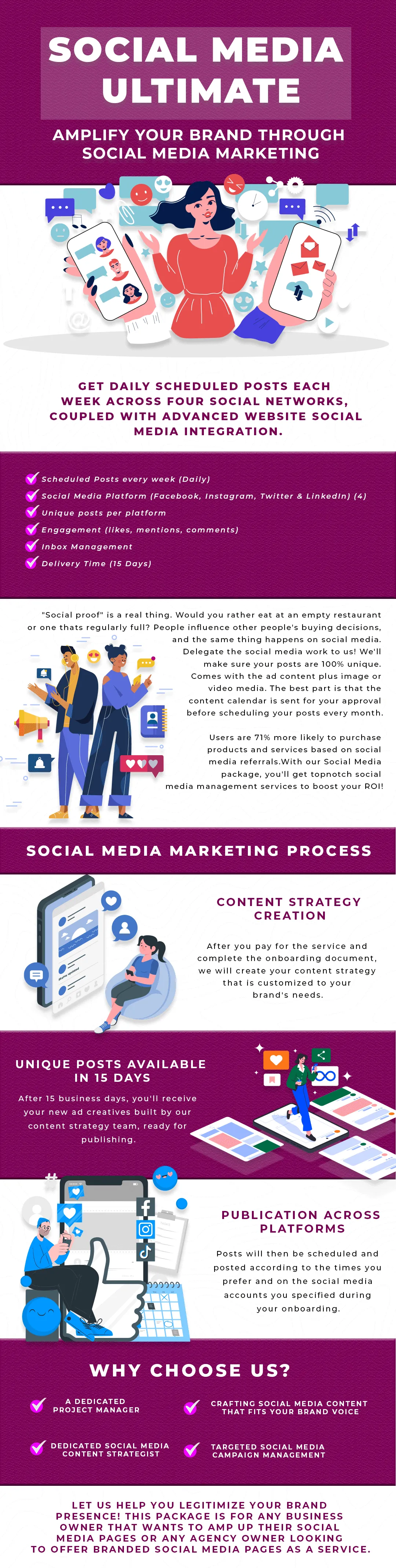 "Social proof" is a real thing. Would you rather eat at an empty restaurant or a regularly full restaurant? People influence other people's buying decisions, and the same thing happens on social media. Delegate the social media work to us! We'll make sure your posts are 100% unique. Comes with the ad content plus image or video media. The best part is that the content calendar is sent for your approval before scheduling your posts every month.